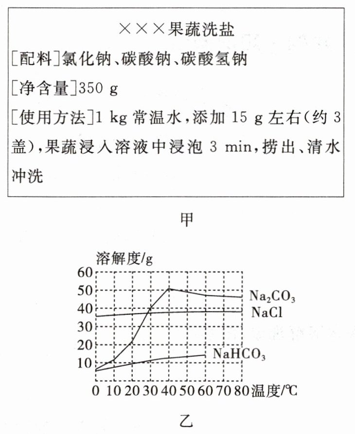 水是常见的溶剂。“果蔬洗盐”是一种果蔬清洁剂,某果蔬洗盐的部分标签如图甲所示,配料中物质的溶解度曲线如图乙所示。