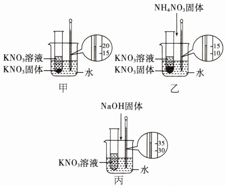 4.(跨学科实践)利用20℃时KNO₃溶液(有少量未溶解的KNO₃固体)见图甲,进行下面实验:①加入NH₄NO₃固体后,实验结果见图乙;②加入NaOH固体后,实验结果见图丙。分析实验过程判断,以下说法错误的是( )
