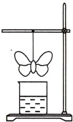 9. 将滤纸折成蝴蝶形状并喷洒某种溶液或试剂后,悬挂于铁架台上。另取一只盛有某未知溶液的烧杯,放在纸蝴蝶的下方(如图)。一会儿,纸蝴蝶的颜色发生变化,请回答下列问题: