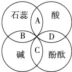 7. 某同学在学习酸碱指示剂与常见酸、碱溶液作用时,归纳成如图所示的关系。图中 A、B、C、D 是两圆相交的部分,分别表示指示剂与酸、碱溶液作用时所显示出的颜色,则其中表示不正确的是 ( )