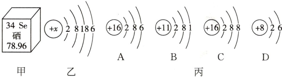 (2)图乙是某原子结构示意图,其中x的值是____________,该元素的化学性质与图丙中____________(填字母)微观粒子的化学性质相似。