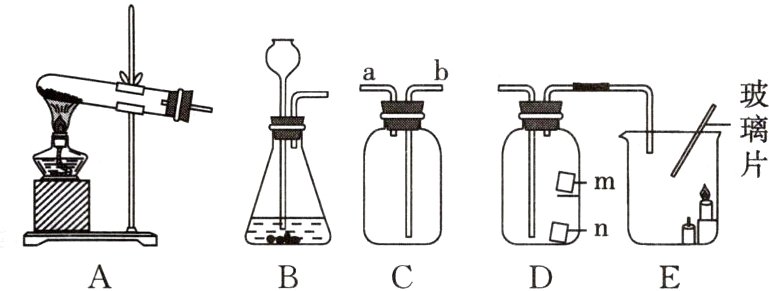 (3)D装置中,m、n处分别放有湿润、干燥的蓝色石蕊试纸,证明$CO_{2}$能与水反应的现象是______________________________;通过E装置产生的现象可证明$CO_{2}$具有______________________________的性质。