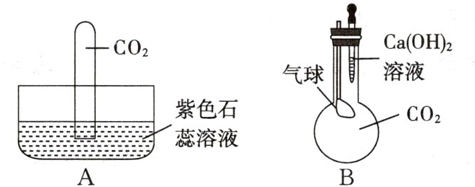 (1)甲同学将收集满$CO_{2}$气体的试管倒插入紫色石蕊溶液中(如图A所示),并轻轻振荡试管。