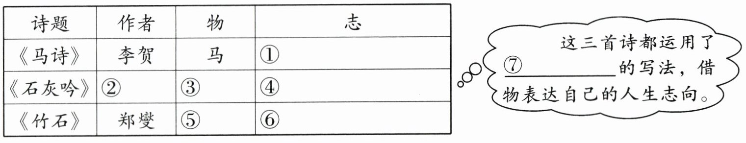 1.①渴望建功立业的远大抱负 ②于谦 ③石灰 ④不畏艰难、坚贞不屈 ⑤竹子 ⑥刚正不阿、铁骨铮铮 托物言志