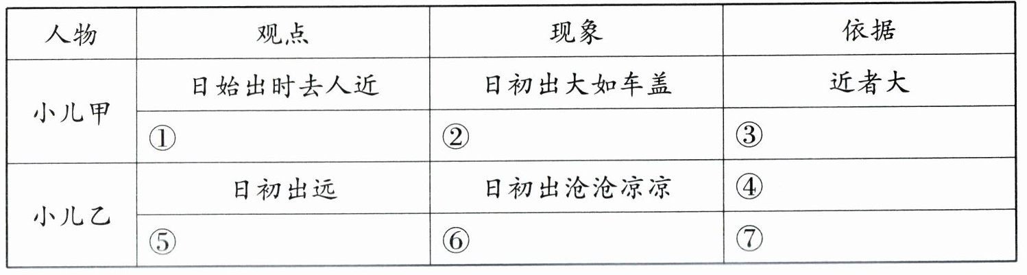 1.(新题型)梳理文中两小儿辩斗的观点、现象与依据,把表格补充完整。