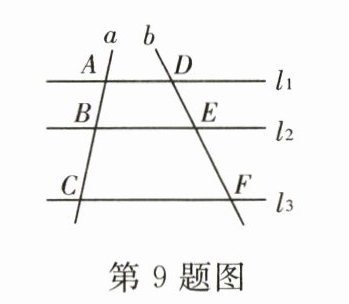 9. 如图,$l_1// l_2// l_3$,直线$a$,$b$与$l_1$,$l_2$,$l_3$分别相交于点$A$,$B$,$C$和点$D$,$E$,$F$. 若$\frac{AB}{BC}=\frac{2}{3}$,$DE = 4$,则$DF$的长是_______.