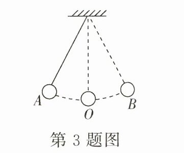0 重力势 不变 [解析]A、B两点等高,说明摆球由A点静止释放,经过最低点O到达B点的过程中没有能量损失,即从A点到B点的过程中机械能守恒,则A点的动能等于B点的动能,摆球在A点静止,动能为0J,所以摆球到达B点时动能为0J;摆球从A点到O点的过程中,质量不变,高度降低,速度变大,则重力势能减少,动能增多,重力势能转化为动能。