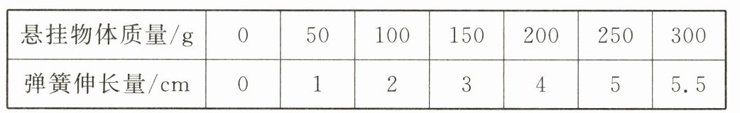 (3)从数据可以看出,悬挂的物体质量每增加50g,弹簧伸长量增加1cm,悬挂的物体质量最大为250g = 0.25kg,所以拉力不能超过0.25kg×10N/kg = 2.5N;