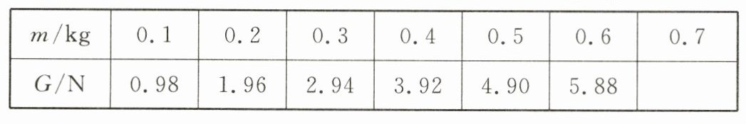 (2)分析数据可得,重力与质量的比值$\frac{G}{m}$ = 9.8N/kg,当物体的质量为0.7kg时,它受到的重力为:G = 0.7kg×9.8N/kg = 6.86N;