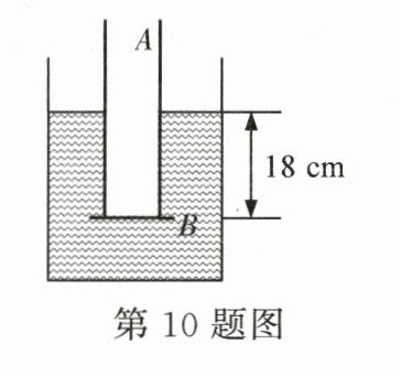 10.易错题如图所示,在玻璃槽中装有水,A为两端开口的玻璃管,B为塑料片(质量不计)。B 在水面下的深度为18cm,向管内缓缓注入密度为$1.2×10^3kg/m^3$的硫酸铜溶液,当塑料片B 恰好脱落时,玻璃管内液柱的高度为 ( )
