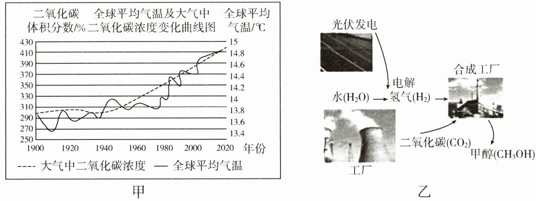 (1)大气中二氧化碳浓度升高,全球平均气温也升高,且趋势相同(合理即可)