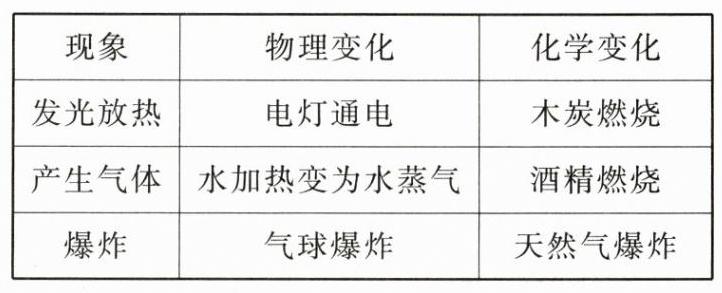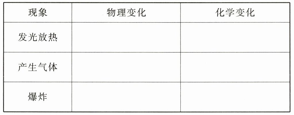 11. 开放性 物质发生变化时常伴随着一些现象,这些现象有助于我们判断物质是否发生了化学变化。但有了这些现象,就一定发生了化学变化吗?根据你学习的化学知识和在生活中的观察,请对应有关现象,各举出一个分别属于物理变化和化学变化的例子填入下表。