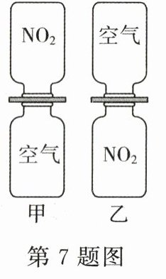 7. 为了验证分子的特点,小华和小文分别按右图所示的两个装置进行实验,他们分别取一瓶红棕色的二氧化氮气体和一瓶无色的空气口对口放置,取下中间的玻璃片,发现甲和乙中的两瓶气体都逐渐变红,且甲变红的快些,由此不能得出的结论是( )