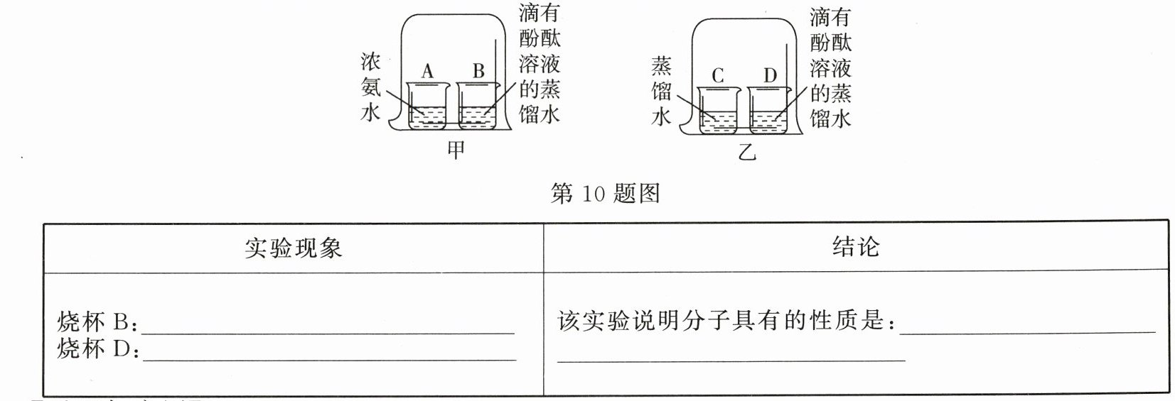 (2)由于氨水具有挥发性,并且显碱性,所以烧杯B中酚酞溶液变红,蒸馏水显中性,不能使酚酞溶液变色,所以烧杯D中酚酞溶液不变色,该实验说明了分子是在不断运动的。