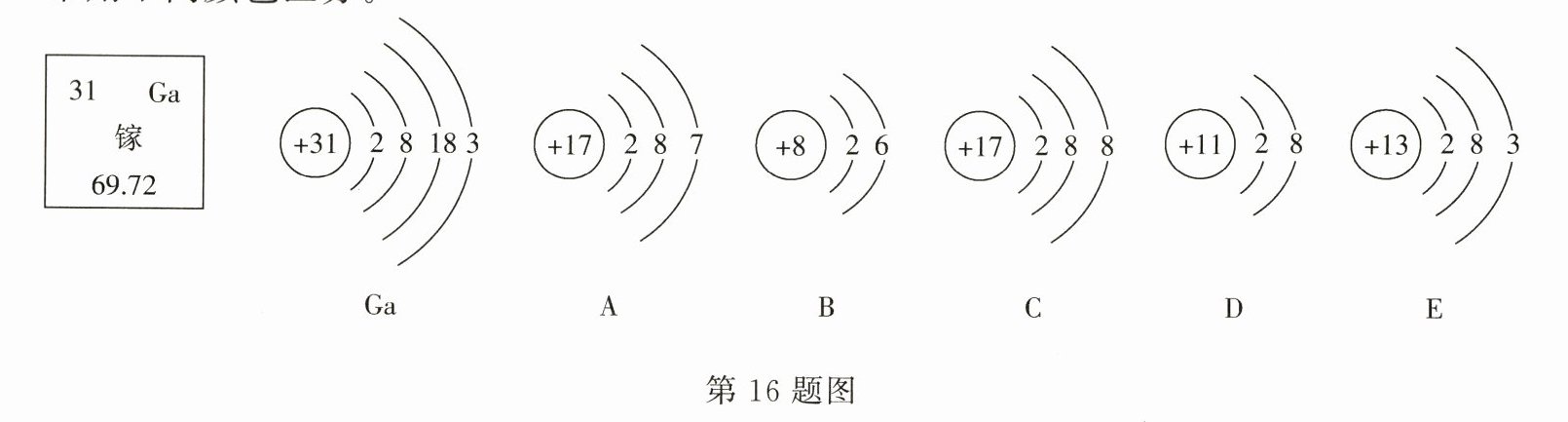 16.(2024.广安中考)金属镓(Ga)可用于制作半导体,镓元素在元素周期表的信息以及Ga、A、B、C、D、E的微粒结构示意图如图所示。元素周期表中,金属元素、非金属元素和稀有气体元素常用不同颜色区分。