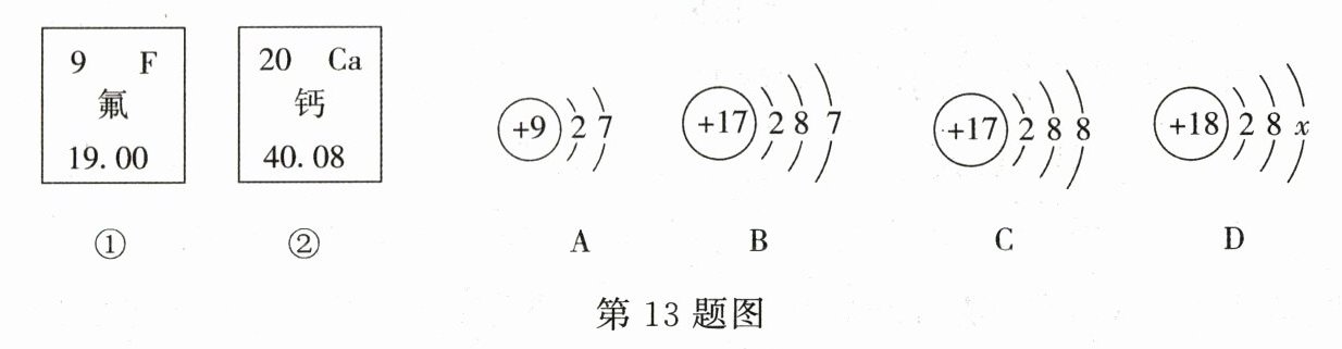 (1)氟元素的相对原子质量是________,钙元素的原子序数是________,D中x=________;