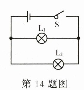 14. 如图所示的电路中,灯L₁标有“6 V 0.5 A”的字样,灯L₂标有“3 V 0.3 A”的字样。该电路长时间工作时只允许灯________正常发光,此时另一只灯泡的实际功率是________W。(不考虑灯丝电阻受温度的影响)