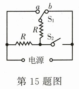 15. 某家用电热水器的工作原理如图所示,已知两个电阻丝的阻值相等,电源电压保持不变,该电热水器有高温、中温、低温三个挡位。开关S₁接b,S₂断开时,它是处于________挡,此时电功率为P₁;开关S₁接a,S₂闭合时,此时电功率为P₂,则P₁∶P₂ = ________。