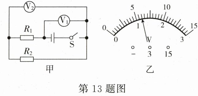 13. 如图所示的电路中,当闭合开关S后,电路正常工作。两只电压表指针位置均为图乙所示,则电阻R₁两端电