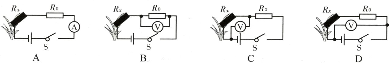 4. 跨学科 如何从外部检测植物含水量的变化呢?科学家用条状石墨烯制成的湿敏电阻$R_x$附着在叶片上,植物含水量变低,$R_x$变小,电表示数变小;植物含水量变高,$R_x$变大,电表示数变大。电源电压恒定,$R_0$为定值电阻,下列电路图中符合要求的是 ( )