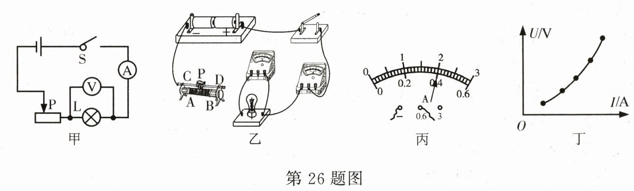 26. 小明在实验室做“测量小灯泡电功率”和“探究电流与电压电阻关系”的实验。实验中,所用的电源电压为6 V,小灯泡的额定电压为3.8 V,滑动变阻器的规格为“30 Ω 1 A”。