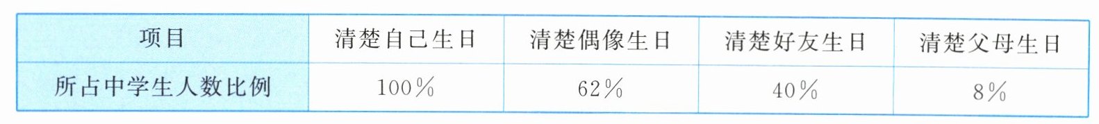 (3)示例:中学生都知道自己的生日,但知道父母生日的还不到一成。感想:可怜天下父母心,我们应该多关心自己的父母。