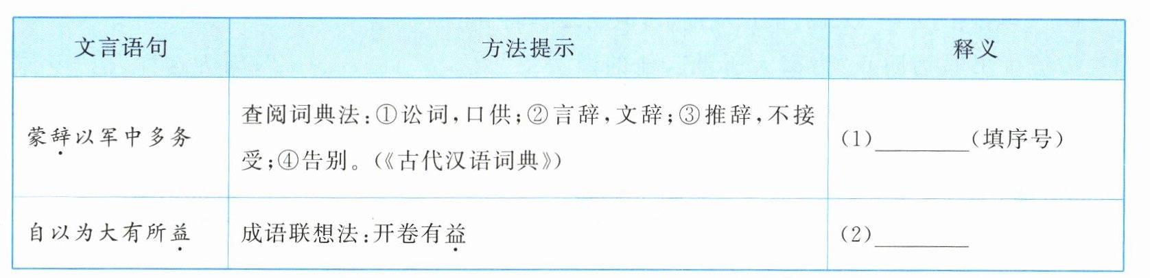 6. 资治通鉴7.(1)③ (2)益处,好处8. 孙权劝学 吕蒙就学 鲁肃赞学9. 通过鲁肃与吕蒙对话和“结友”,侧面表现吕蒙的才干和学识有了惊人的长进。10. ①开卷有益:读书可以增长人的学识,有益于人的完善和发展;②要虚心听取别人的正确意见;③学习没有早晚之分,只要认真且努力,终有所成;④不能因繁忙就放弃学习,零碎的时间也可利用。(答出两点即可)