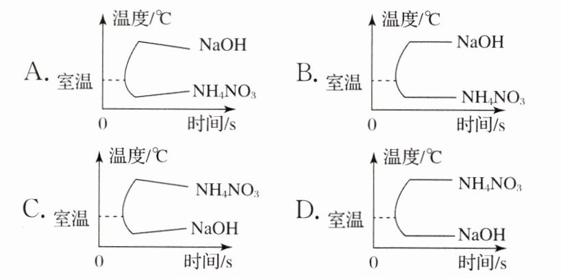 8.将相同质量的NaOH固体和NH₄NO₃固体,分别同时放入2个装有100mL水的烧杯中,用仪器测出溶液温度随时间的变化情况,则下列曲线正确的是 ( )