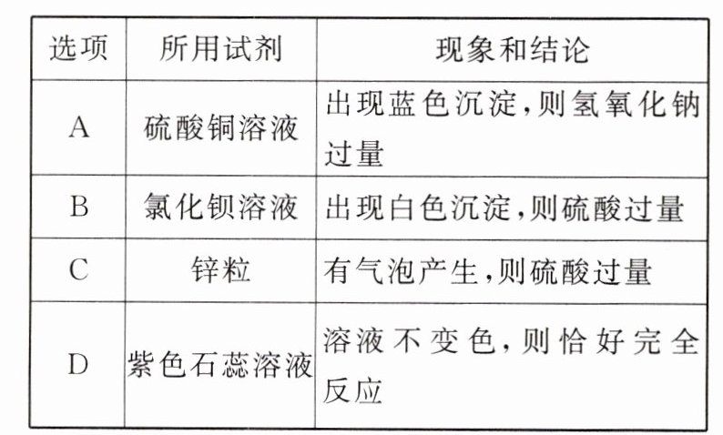 3. 研究性学习小组为了探究氢氧化钠溶液与稀硫酸是否恰好完全反应,分别取少量反应后的溶液于试管中,用下表中的不同试剂进行实验。下列选项错误的是 ( )