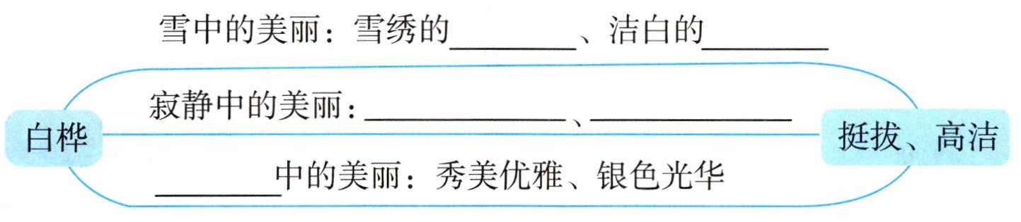 2. 诗句中“_____”一词写出了雪中白桦的颜色美,“_____”字把树当作人来写,把白桦落满雪花的样子写活了。