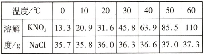 [解析](5)分析题表中的数据可知,0~20 ℃时,NaCl的溶解度大于KNO₃的溶解度,30~60 ℃时,NaCl的溶解度小于KNO₃的溶解度,所以KNO₃和NaCl溶解度相同的温度应在20~30 ℃之间。