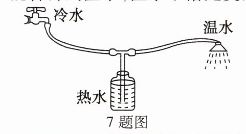 7. 某同学设计的冷热水混合淋浴器如图所示。图中水平连接部分管径较细,冷水流经此处时,流速大、压强________,瓶中的热水在________作用下________(选填“上升”或“下降”),从而与冷水混合得到温水,温水下落是受到________的作用。