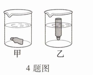4. 小红取一只空牙膏皮,一次将它挤瘪,一次将它撑开,两次都拧紧盖,先后放入桌面上同一杯水中,结果如图甲、乙所示。牙膏皮在甲中受到的浮力________(选填“大于”“小于”或“等于”)在乙中受到的浮力。