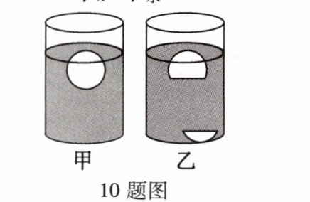 10.(黄冈中考)物理课上,老师将整个橙子放入水中,漂浮在水面上,如图甲。将其切成大小两块,再次投入水中,发现大块仍漂浮,小块缓慢沉入水底,如图乙。下列说法正确的是 ( )