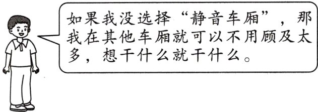 铁路部门在京沪、成渝高铁的部分车次试点“静音车厢”服务。“静音车厢”可为旅客提供更加安静、舒适的旅行环境,愿意遵守相应行为规范的旅客,购票时可自行选择“静音车厢”,并遵守“静音”约定。对此,某校八年级(1)班小吉同学发表了自己的看法: