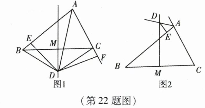 22. (本小题12分)如图1,△ABC的边BC的中垂线DM交∠BAC的平分线AD于D,DE⊥AB于点E,DF⊥AC于F. 连接DB、DC.