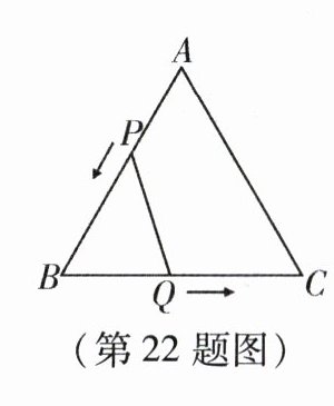 22. (本小题12分)如图,$\triangle ABC$是边长为3cm的等边三角形,动点$P$,$Q$同时从$A$,$B$两点出发,分别沿$AB$,$BC$的方向匀速移动,它们的速度都是1cm/s,当点$P$到达点$B$时,$P$,$Q$两点停止运动.设点$P$的运动时间为$t\ s$,则当$t$为何值时,$\triangle PBQ$是直角三角形?