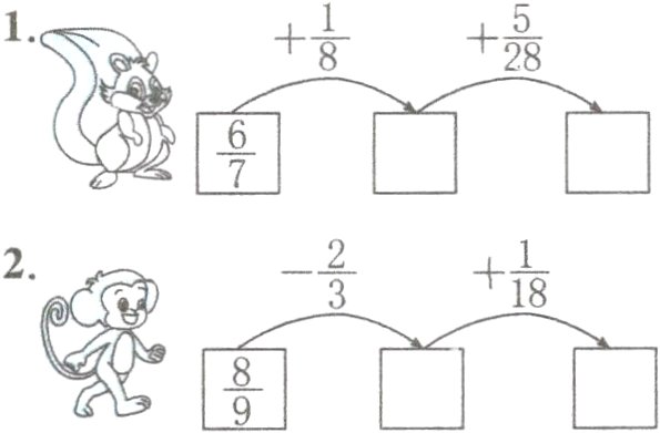 1. $\frac{55}{56}$ $\frac{65}{56}$ 2. $\frac{2}{9}$ $\frac{1}{6}$