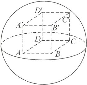 解:作轴截面如图所示,$CC'=\sqrt{6}$,$AC=\sqrt{2}\cdot\sqrt{6}=2\sqrt{3}$,设球的半径为$R$,则$R^{2}=OC^{2}+CC'^{2}=(\sqrt{6})^{2}+(\sqrt{3})^{2}=9$。