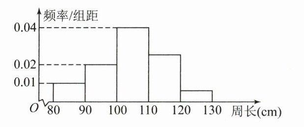 9. 为了了解一片经济林的生长情况,随机测量了其中100株树木的底部周长(单位:cm). 根据所得数据画出样本的频率分布直方图(如图),那么在这100株树木中,底部周长小于110 cm的株数是 ( )