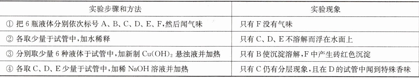 24.(8分)现有6瓶失去标签的液体,已知它们可能是乙醇、乙酸、苯、乙酸乙酯、油脂、葡萄糖中的一种。现通过如下实验来确定各试剂瓶中所装液体的名称: