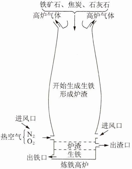1. 原料:铁矿石、焦炭、空气、石灰石。