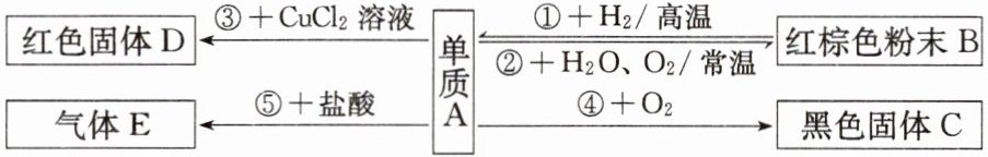(2) Fe + Cu²⁺ = Fe²⁺ + Cu,Fe + 2H⁺ = Fe²⁺ + H₂↑ [解析]推断题的解题思路:根据物质的物理性质(特别是色、态)和化学性质(相互转化关系、反应条件等),找出具有特征条件的物质,再由相互转化关系逐步推断。如本题中结合B、C、D的颜色及与CuCl₂、盐酸反应的性质可推知A为Fe。