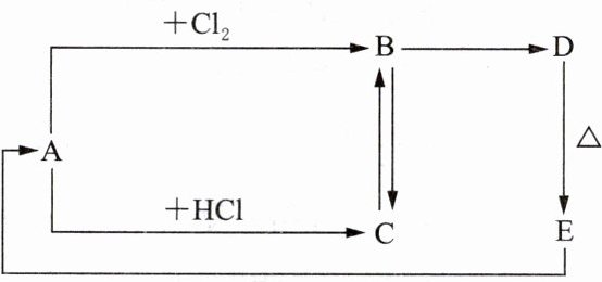 8.A、B、C、D、E分别是铁或铁的化合物,其中D是一种红褐色沉淀,其相互反应关系如右图所示,据此回答下列问题。