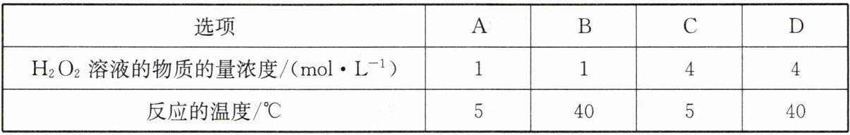 例2. 控制变量是科学研究的重要方法。向$2mL H_{2}O_{2}$溶液中滴入$2$滴$1mol\cdot L^{-1} CuSO_{4}$溶液,下列条件下分解速率最快的是 ( )