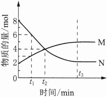 D [解析]由图像可知N为反应物,M为生成物,相同时间段内M、N的物质的量变化之比(与是否达平衡无关)等于M、N的化学计量数之比,即化学方程式是2N = M。t2时刻M、N的物质的量相等,但此时M、N的物质的量仍在发生变化,反应未达到平衡状态,因此正反应速率不等于逆反应速率。t3时刻及t3时刻之后,M、N的物质的量不再改变,证明已达平衡状态,此时,正、逆反应速率相等。