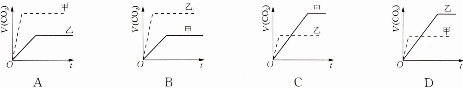 D [解析]甲、乙试管中大理石的状态和质量不同,甲中为1g粉末状的大理石,乙中为2g颗粒状的大理石,产生气体的速率甲比乙快,产生气体的量乙是甲的2倍,因此甲曲线比乙曲线斜率大,乙曲线比甲曲线气体体积大,甲比乙先反应完,分析比较可知D项正确。