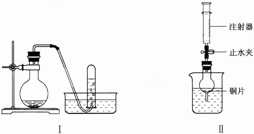 (3) 若用II实验装置进行实验,以证明铜与稀硝酸反应生成的气体是$NO$,在烧杯中加入一定体积的稀硝酸,打开止水夹,用注射器慢慢抽取干燥管内的空气,稀硝酸沿着干燥管慢慢上升,直到充满整个干燥管,停止抽拉注射器,关闭止水夹,观察干燥管内的现象是______________________。反应停止后,打开止水夹,用注射器抽取干燥管内的气体(事先已将注射器内原有的空气推出),关闭止水夹后取下注射器,并抽取一定量的空气,观察到的现象是______________________________。
