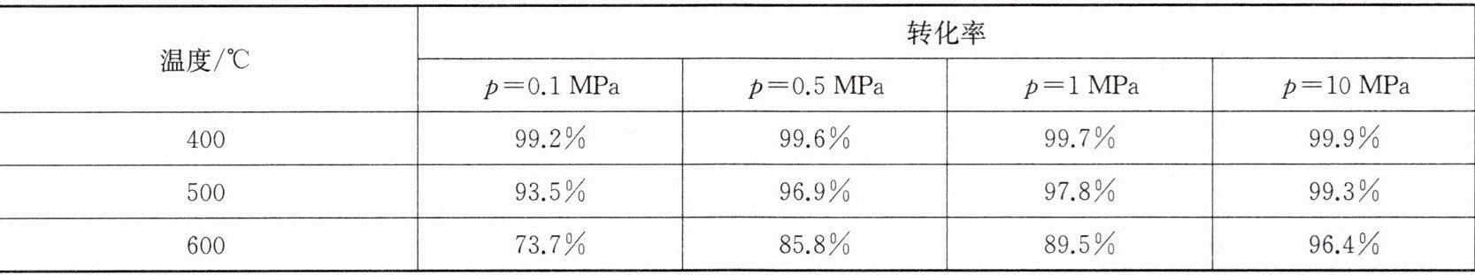 8. 反应2SO₂ + O₂$\stackrel{一定条件}{=\!=\!=}$2SO₃在不同条件下达到平衡状态时SO₂的转化率如下表。