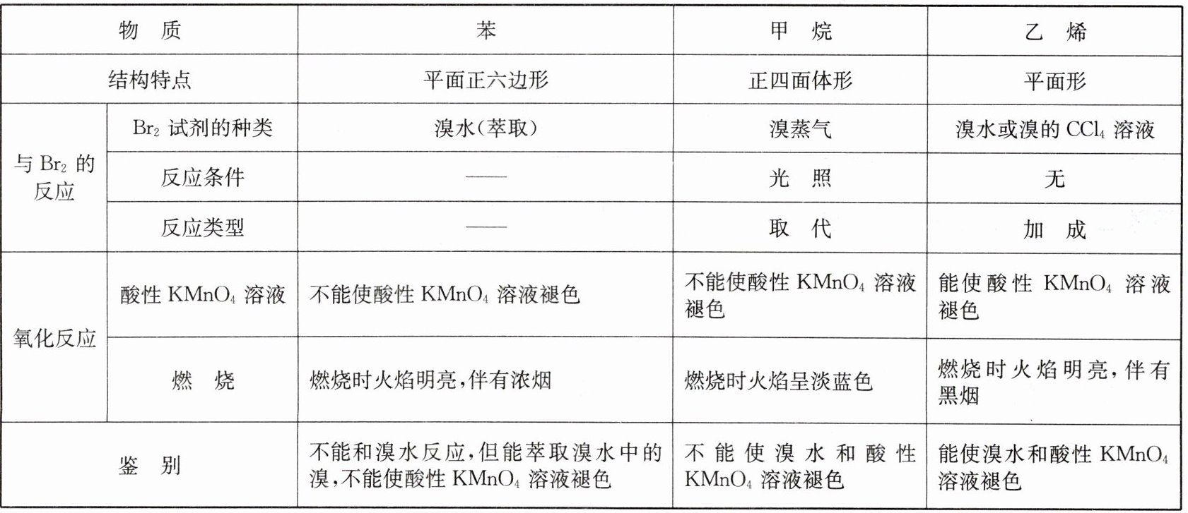 归纳总结 苯、甲烷与乙烯的结构和典型性质的比较: